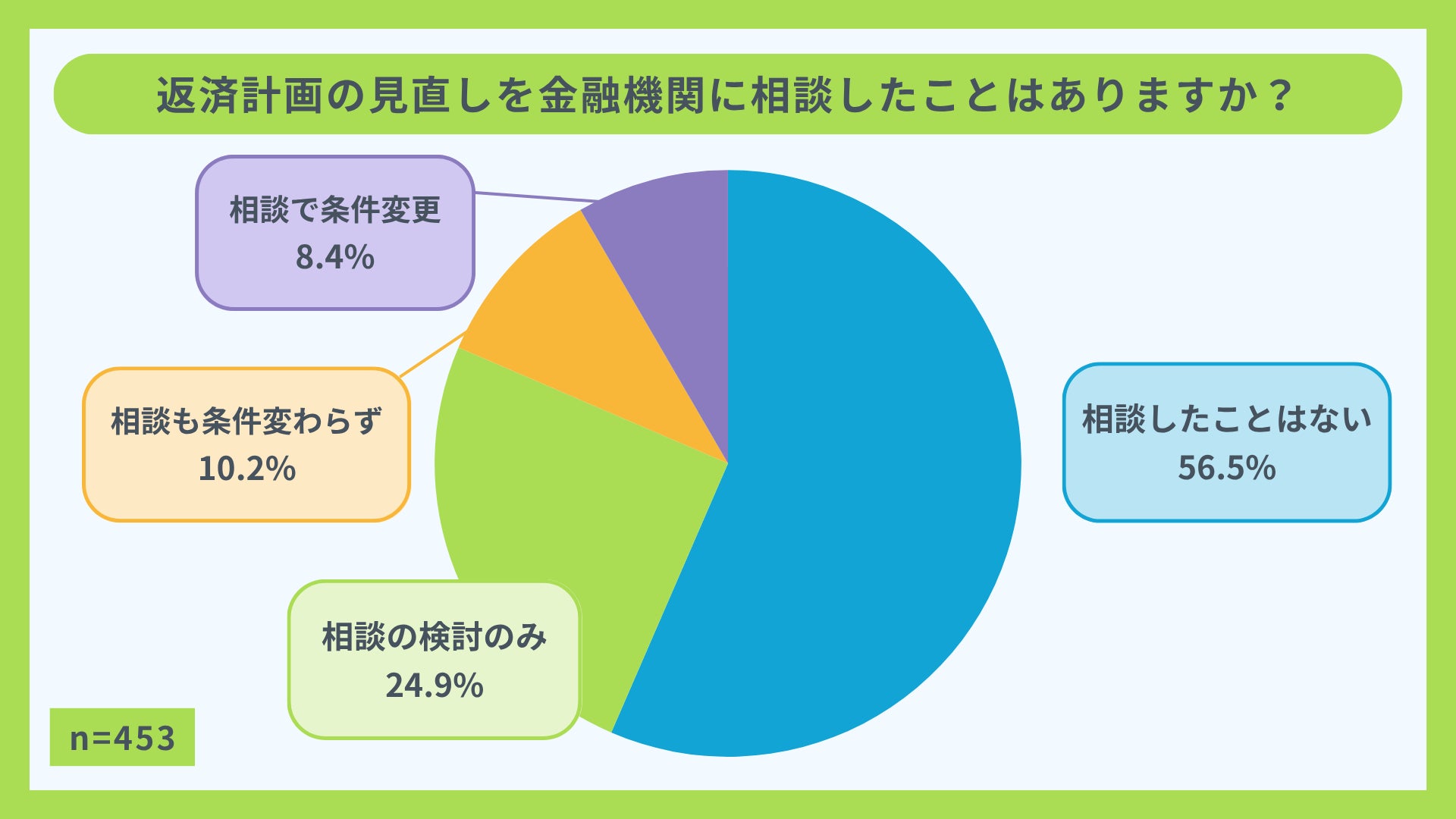 - 実際に金融機関へ返済相談をした方は全体の18.6%にとどまり、約8割は「未相談」のまま問題を抱えている。