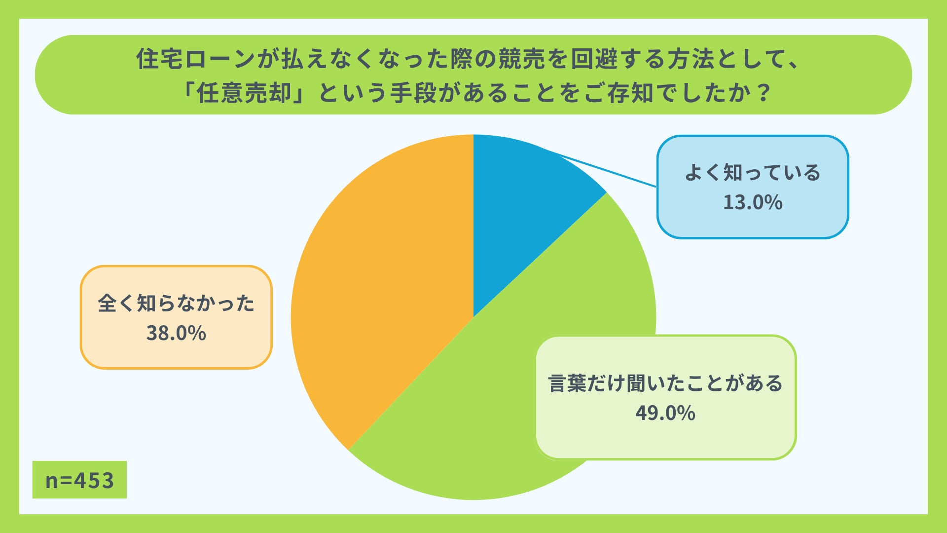 任意売却を「よく知っている」は13.0%にとどまり、競売回避策の認知不足が明らかとなりました。