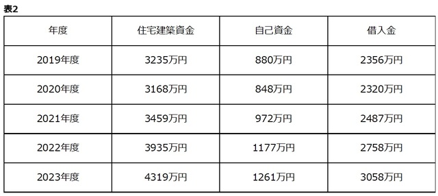 住宅ローン減税の2026年以降の見通しは不透明ですが、住宅購入は早めに決断した方がいいかもしれません。国土交通省の調査を基に、住宅建築資金の全国平均の推移を表2にまとめました。